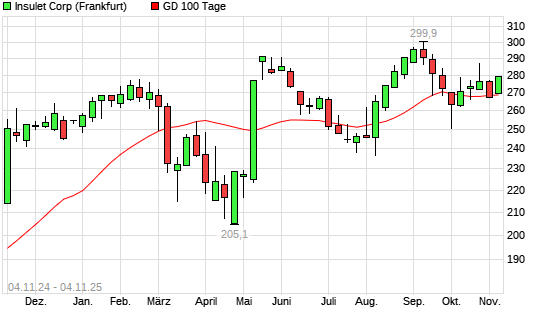 Mit dem Anstieg auf 276,80 EUR hat die Insulet Corp-Aktie am 03.11.2025 die 100-Tage-Linie nach oben gekreuzt.