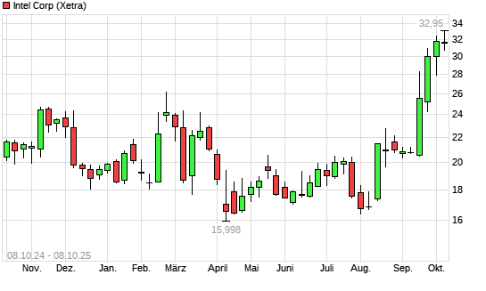 Mit dem Anstieg auf 32,04 EUR hat die Intel-Aktie (ISIN US4581401001) am 07.10.2025 ein neues 12-Monats-Hoch erreicht und damit den Kurs vom 02.10.2025 eingestellt.
