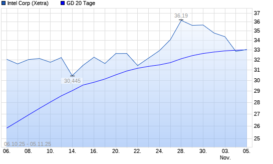 Mit dem Rücksetzer auf 32,15 EUR hat die Intel-Aktie am 04.11.2025 die 20-Tage-Linie nach unten gekreuzt.