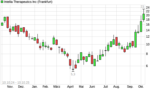 Mit dem Anstieg auf 22,41 EUR hat die Intellia Therapeutics-Aktie (ISIN US45826J1051) am 09.10.2025 ein neues 12-Monats-Hoch erreicht und damit den Kurs vom 08.10.2025 eingestellt.