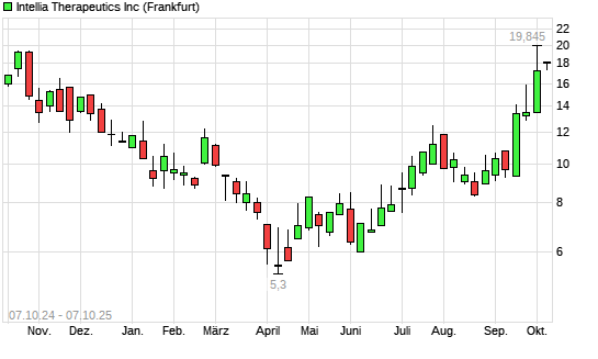 Mit dem Anstieg auf 17,81 EUR hat die Intellia Therapeutics-Aktie (ISIN US45826J1051) am 06.10.2025 ein neues 6-Monats-Hoch erreicht und damit den Kurs vom 03.10.2025 eingestellt.