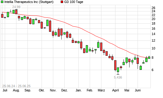 Mit dem Anstieg auf 8,46 EUR hat die Intellia Therapeutics-Aktie am 24.06.2025 die 100-Tage-Linie nach oben gekreuzt.