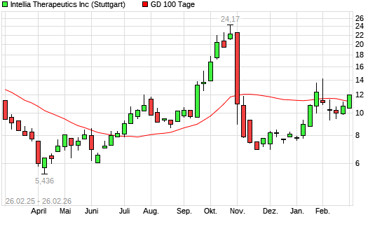 Mit dem Anstieg auf 11,45 EUR hat die Intellia Therapeutics-Aktie am 25.02.2026 die 100-Tage-Linie nach oben gekreuzt.