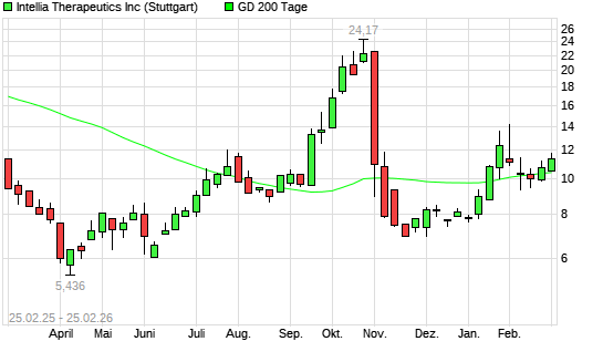 Mit dem Anstieg auf 10,69 EUR hat die Intellia Therapeutics-Aktie am 24.02.2026 die 200-Tage-Linie nach oben gekreuzt.