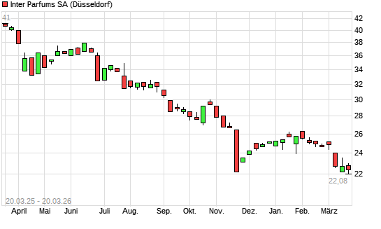 Mit dem Rücksetzer auf 21,68 EUR hat die Inter Parfums-Aktie (ISIN FR0004024222) am 19.03.2026 ein neues 5-Jahres-Tief erreicht und damit den Kurs vom 09.03.2026 eingestellt.