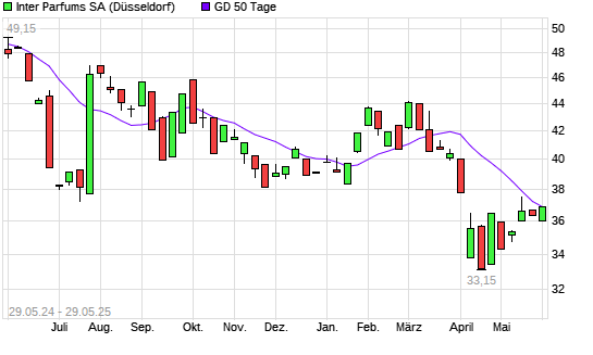Mit dem Anstieg auf 36,84 EUR hat die Inter Parfums-Aktie am 28.05.2025 die 50-Tage-Linie nach oben gekreuzt.