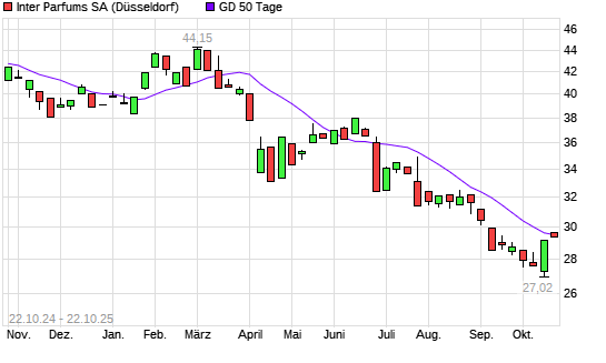 Mit dem Rücksetzer auf 29,50 EUR hat die Inter Parfums-Aktie am 21.10.2025 die 50-Tage-Linie nach unten gekreuzt.