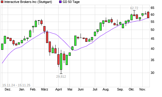 Mit dem Rücksetzer auf 57,12 EUR hat die Interactive Brokers-Aktie am 14.11.2025 die 50-Tage-Linie nach unten gekreuzt.