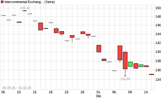 Mit dem Rücksetzer auf 135,04 EUR hat die IntercontinentalExchange Group-Aktie (ISIN US45866F1049) am 15.10.2025 ein neues 12-Monats-Tief erreicht und damit den Kurs vom 06.10.2025 eingestellt.