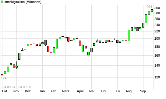 Mit dem Anstieg auf 294,00 EUR hat die Interdigital-Aktie (ISIN US45867G1013) am 23.09.2025 ein neues All-Time-High erreicht und damit den Kurs vom 22.09.2025 eingestellt.