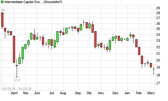 Mit dem Rücksetzer auf 18,60 EUR hat die Intermediate Capital Group-Aktie (ISIN GB00BYT1DJ19) am 03.03.2026 ein neues 6-Monats-Tief erreicht und damit den Kurs vom 02.03.2026 eingestellt.