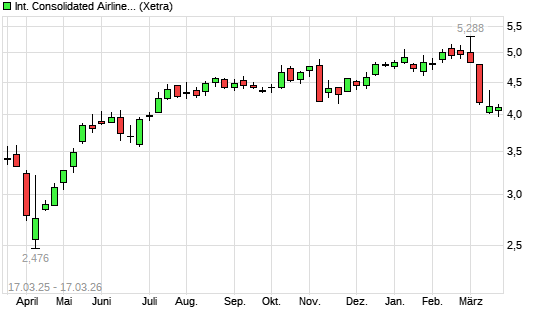 Mit dem Rücksetzer auf 4,13 EUR hat die International Airlines Group-Aktie (ISIN ES0177542018) am 16.03.2026 ein neues 6-Monats-Tief erreicht und damit den Kurs vom 13.03.2026 eingestellt.