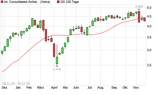 Mit dem Anstieg auf 4,45 EUR hat die International Airlines Group-Aktie am 17.11.2025 die 100-Tage-Linie nach oben gekreuzt.