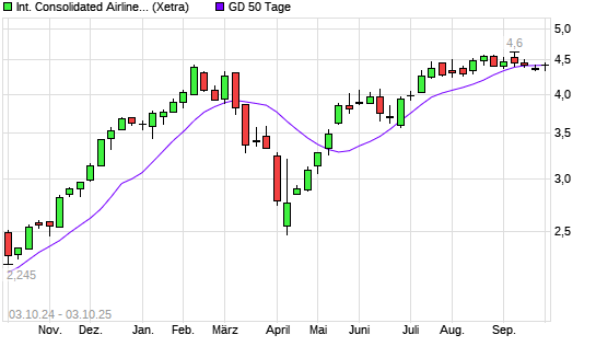 Mit dem Rücksetzer auf 4,33 EUR hat die International Airlines Group-Aktie am 02.10.2025 die 50-Tage-Linie nach unten gekreuzt.