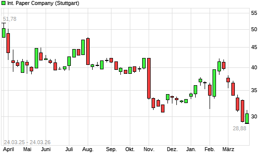 Mit dem Rücksetzer auf 29,01 EUR hat die International Paper-Aktie (ISIN US4601461035) am 23.03.2026 ein neues 12-Monats-Tief erreicht und damit den Kurs vom 20.03.2026 eingestellt.