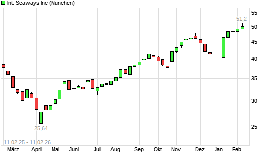 Mit dem Anstieg auf 50,72 EUR hat die International Seaways-Aktie (ISIN MHY410531021) am 10.02.2026 ein neues 12-Monats-Hoch erreicht und damit den Kurs vom 20.11.2025 eingestellt.