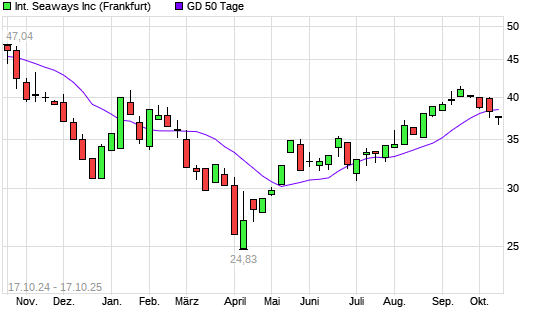 Mit dem Anstieg auf 39,27 EUR hat die International Seaways-Aktie am 16.10.2025 die 50-Tage-Linie nach oben gekreuzt.