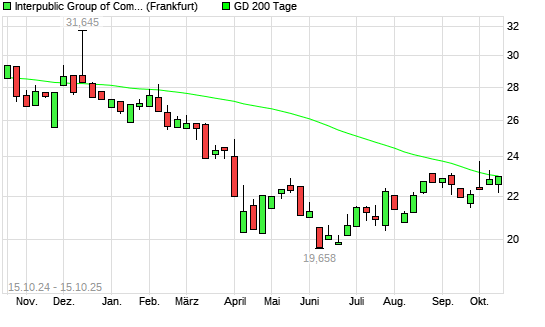Mit dem Rücksetzer auf 22,20 EUR hat die Interpublic Group-Aktie am 14.10.2025 die 200-Tage-Linie nach unten gekreuzt.