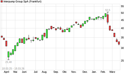Mit dem Rücksetzer auf 32,08 EUR hat die Interpump Group-Aktie (ISIN IT0001078911) am 17.03.2026 ein neues 6-Monats-Tief erreicht und damit den Kurs vom 16.03.2026 eingestellt.