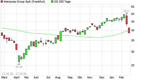 Mit dem Rücksetzer auf 39,34 EUR hat die Interpump Group-Aktie am 16.02.2026 die 200-Tage-Linie nach unten gekreuzt.