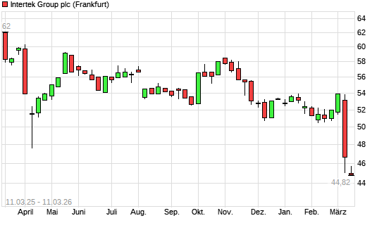 Mit dem Rücksetzer auf 44,96 EUR hat die Intertek Group-Aktie (ISIN GB0031638363) am 10.03.2026 ein neues 12-Monats-Tief erreicht und damit den Kurs vom 03.03.2026 eingestellt.