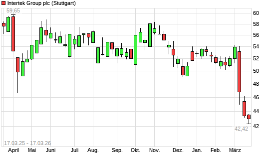 Mit dem Rücksetzer auf 43,02 EUR hat die Intertek Group-Aktie (ISIN GB0031638363) am 16.03.2026 ein neues 3-Jahres-Tief erreicht und damit den Kurs vom 16.11.2023 eingestellt.