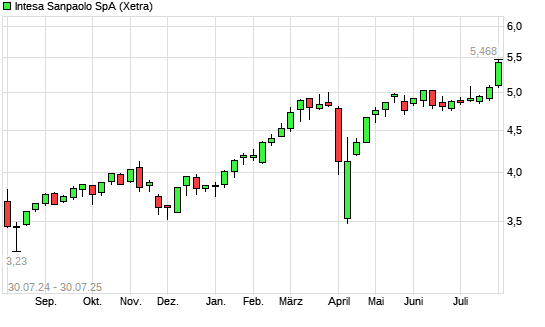 Mit dem Anstieg auf 5,22 EUR hat die Intesa Sanpaolo-Aktie (ISIN IT0000072618) am 29.07.2025 ein neues 10-Jahres-Hoch erreicht und damit den Kurs vom 28.07.2025 eingestellt.