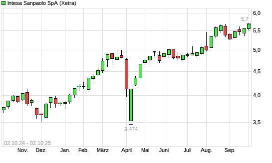 Mit dem Anstieg auf 5,70 EUR hat die Intesa Sanpaolo-Aktie (ISIN IT0000072618) am 01.10.2025 ein neues 10-Jahres-Hoch erreicht und damit den Kurs vom 22.08.2025 eingestellt.