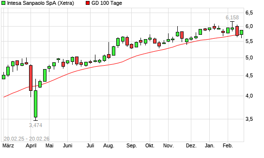 Mit dem Rücksetzer auf 5,73 EUR hat die Intesa Sanpaolo-Aktie am 19.02.2026 die 100-Tage-Linie nach unten gekreuzt.