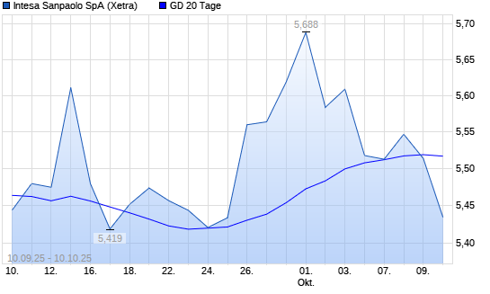 Mit dem Rücksetzer auf 5,51 EUR hat die Intesa Sanpaolo-Aktie am 09.10.2025 die 20-Tage-Linie nach unten gekreuzt.
