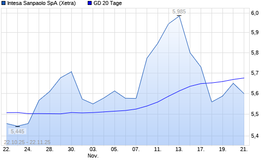 Mit dem Rücksetzer auf 5,64 EUR hat die Intesa Sanpaolo-Aktie am 21.11.2025 die 20-Tage-Linie nach unten gekreuzt.