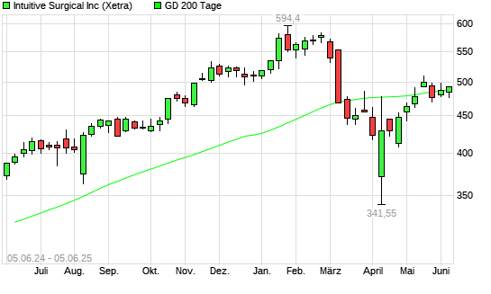 Mit dem Anstieg auf 488,80 EUR hat die Intuitive Surgical-Aktie am 04.06.2025 die 200-Tage-Linie nach oben gekreuzt.
