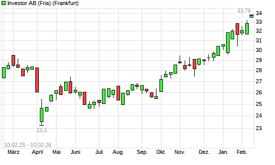 Mit dem Anstieg auf 33,54 EUR hat die Investor A-Aktie (ISIN SE0015811955) am 09.02.2026 ein neues All-Time-High erreicht und damit den Kurs vom 02.02.2026 eingestellt.