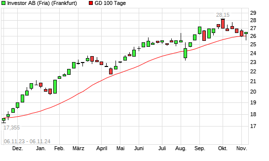 Mit dem Rücksetzer auf 25,55 EUR hat die Investor A-Aktie am 05.11.2024 die 100-Tage-Linie nach unten gekreuzt.