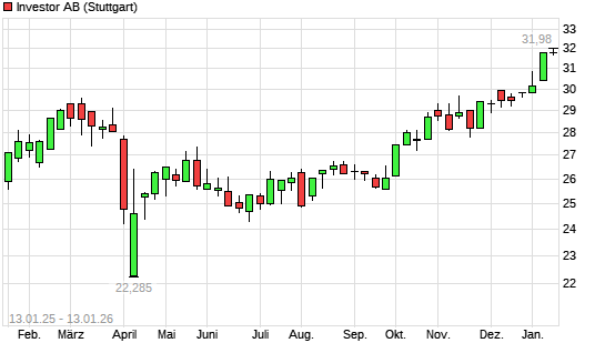 Mit dem Anstieg auf 31,93 EUR hat die Investor B-Aktie (ISIN SE0015811963) am 12.01.2026 ein neues All-Time-High erreicht und damit den Kurs vom 07.01.2026 eingestellt.