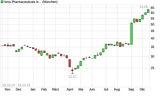 Mit dem Anstieg auf 61,86 EUR hat die Ionis Pharmaceuticals-Aktie (ISIN US4622221004) am 17.10.2025 ein neues 5-Jahres-Hoch erreicht und damit den Kurs vom 16.10.2025 eingestellt.