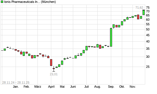 Mit dem Anstieg auf 70,66 EUR hat die Ionis Pharmaceuticals-Aktie (ISIN US4622221004) am 27.11.2025 ein neues 5-Jahres-Hoch erreicht und damit den Kurs vom 26.11.2025 eingestellt.