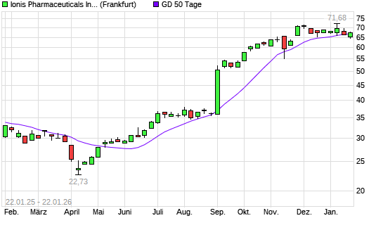 Mit dem Anstieg auf 67,64 EUR hat die Ionis Pharmaceuticals-Aktie am 21.01.2026 die 50-Tage-Linie nach oben gekreuzt.