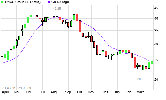 Mit dem Anstieg auf 24,95 EUR hat die Ionos-Aktie am 23.03.2026 die 50-Tage-Linie nach oben gekreuzt.