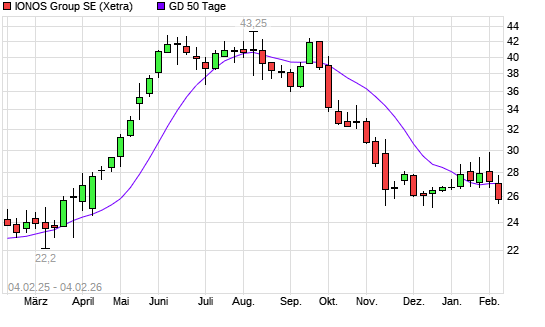Mit dem Rücksetzer auf 26,50 EUR hat die Ionos-Aktie am 03.02.2026 die 50-Tage-Linie nach unten gekreuzt.