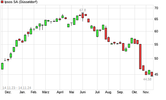 Mit dem Rücksetzer auf 44,64 EUR hat die Ipsos-Aktie (ISIN FR0000073298) am 13.11.2024 ein neues 12-Monats-Tief erreicht und damit den Kurs vom 05.11.2024 eingestellt.