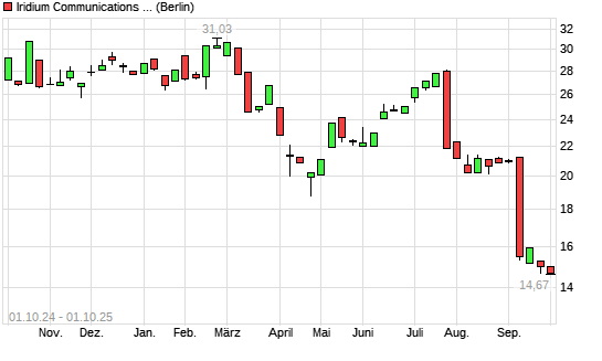 Mit dem Rücksetzer auf 14,68 EUR hat die Iridium Communications-Aktie (ISIN US46269C1027) am 30.09.2025 ein neues 5-Jahres-Tief erreicht und damit den Kurs vom 25.09.2025 eingestellt.