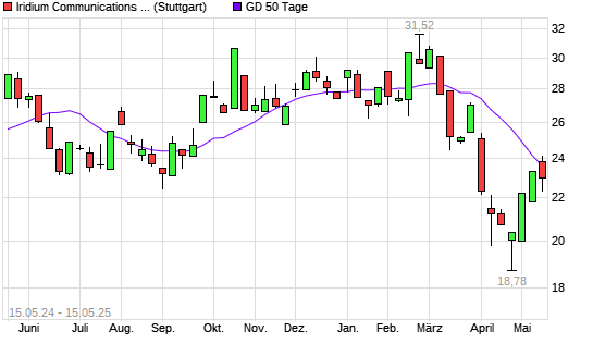 Mit dem Rücksetzer auf 22,72 EUR hat die Iridium Communications-Aktie am 14.05.2025 die 50-Tage-Linie nach unten gekreuzt.