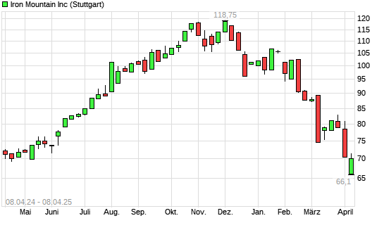 Mit dem Rücksetzer auf 66,54 EUR hat die Iron Mountain-Aktie (ISIN US46284V1017) am 07.04.2025 ein neues 12-Monats-Tief erreicht und damit den Kurs vom 19.04.2024 eingestellt.