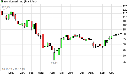 Mit dem Anstieg auf 91,38 EUR hat die Iron Mountain-Aktie (ISIN US46284V1017) am 27.10.2025 ein neues 6-Monats-Hoch erreicht und damit den Kurs vom 15.10.2025 eingestellt.