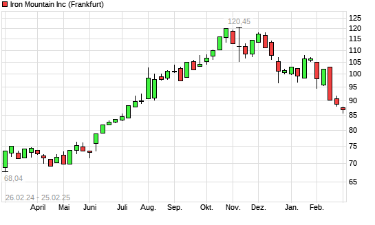 Mit dem Rücksetzer auf 85,62 EUR hat die Iron Mountain-Aktie (ISIN US46284V1017) am 24.02.2025 ein neues 6-Monats-Tief erreicht und damit den Kurs vom 19.02.2025 eingestellt.