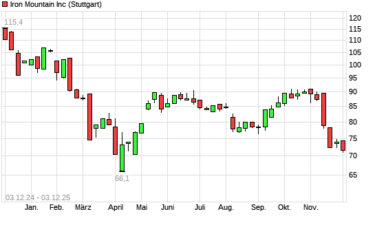 Mit dem Rücksetzer auf 71,24 EUR hat die Iron Mountain-Aktie (ISIN US46284V1017) am 02.12.2025 ein neues 6-Monats-Tief erreicht und damit den Kurs vom 21.11.2025 eingestellt.