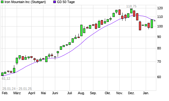 Mit dem Anstieg auf 106,25 EUR hat die Iron Mountain-Aktie am 24.01.2025 die 50-Tage-Linie nach oben gekreuzt.