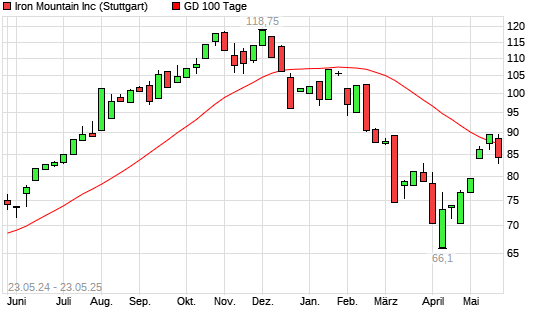 Mit dem Rücksetzer auf 84,64 EUR hat die Iron Mountain-Aktie am 22.05.2025 die 100-Tage-Linie nach unten gekreuzt.
