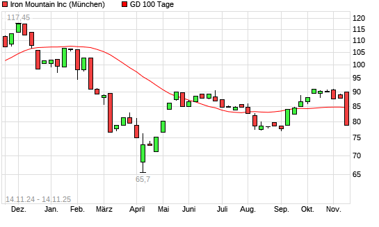 Mit dem Rücksetzer auf 84,48 EUR hat die Iron Mountain-Aktie am 13.11.2025 die 100-Tage-Linie nach unten gekreuzt.